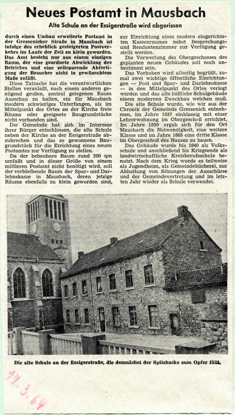 Der Bau einer Schule in Mausbach war schon früh geplant, wurde jedoch lange nicht umgesetzt. Erst im Jahr 1838 wurde schließlich die erste Schule errichtet – 23 Jahre nach den ursprünglichen Planungen.